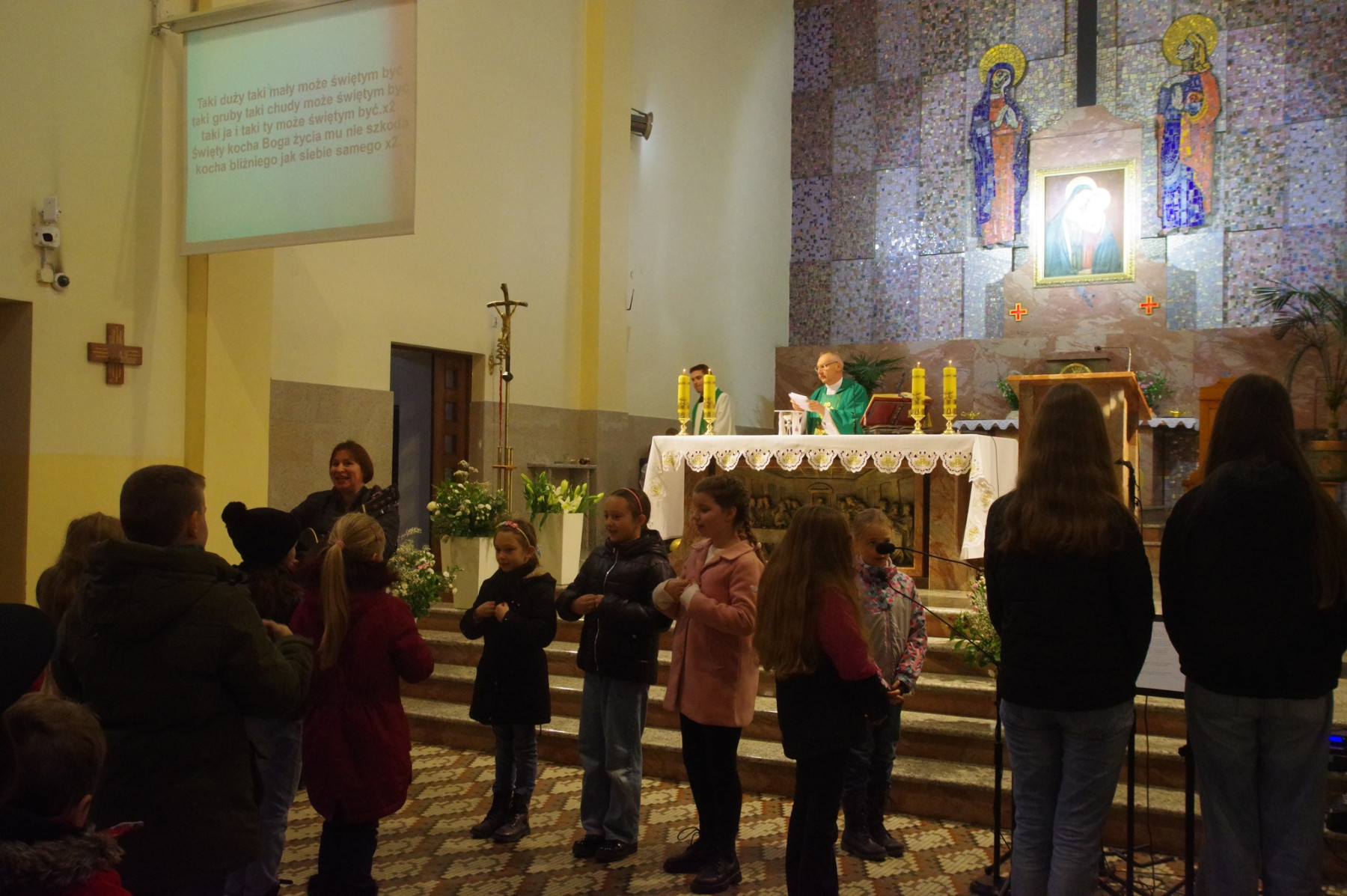 Kilkoro dzieci i rodziców przebralło się za swojego patrona lub ulubionego świętego . Dzieci miały kwiaty